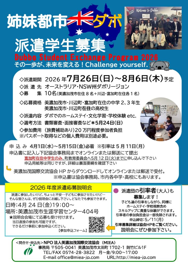 | 2024年度 | 3/15-30 ダボの子どもたちの絵画展(東図書館) 2/22(土)外国につながる先輩との座談会 2/8(土) 6か国料理交流会 1/26(日)姉妹都市ダボとの子どもの絵画交流 アボリジナルアート ワークショップ 2024年度前半の様子⇒広報紙Hello 地球人#70 12/14(土)MIEA 国際クリスマス交流会 11/16(土)国際BBQ交流会 みのかも健康の森 11/2-4 姉妹都市提携35周年記念公式訪問受入 10/24-28 姉妹都市提携35周年記念使節団訪問 10/4(金)~10(木)姉妹都市オーストラリア ダボより派遣生10名&引率2名美濃加茂市に来市 8/3 (土) 13:00-17:00 【美濃加茂市制70周年記念・国際交流inみのかも】~HELLO地球人~ |
